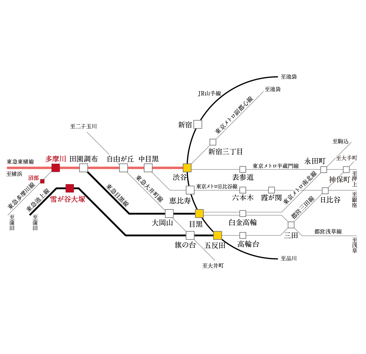 - 東急目黒線急行利用、「目黒」駅より東京メトロ南北線乗り入れ
