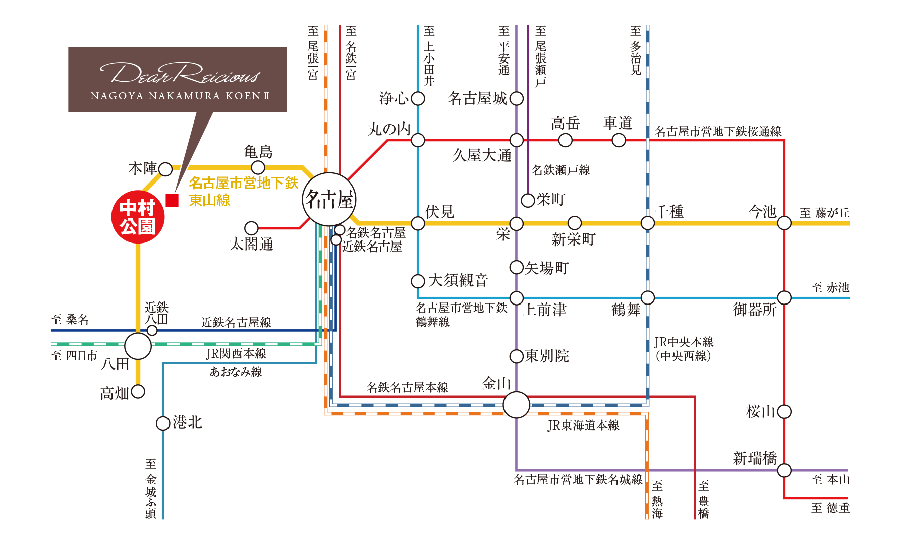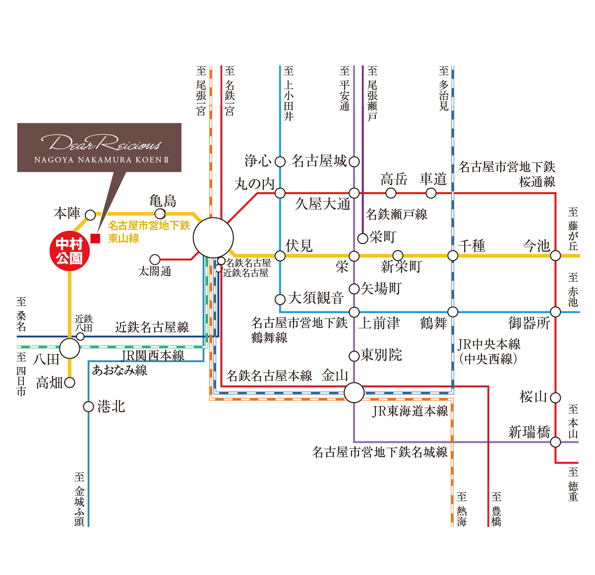 ディアレイシャス「名古屋中村公園Ⅱ」 0120-922-442 03-6880-1009 Century21 レイシャス TOP スペック 物件概要 フロア ロケーション アクセス お問い合わせ お問い合わせ カタログPDF ディアレイシャス「名古屋中村公園Ⅱ」 アクセス 「名古屋」駅を中心に、愛知県各地へスムーズに移動できる快適な時間を実感する。豊かな交通網がもたらすゆとりの時間 名古屋市営地下鉄東山線「中村公園」駅 徒歩2分 約110m/4出入口 「中村公園」駅は、「名古屋」駅までわずか6分でアクセスでき、愛知県内の主要エリアにもスムーズに移動できます。名古屋市内はもちろん、通勤や週末の遠出も便利で、快適に目的地に到達可能です。豊かな交通網が支えるこの立地は、毎日の移動時間を効率よく活用でき、時間にゆとりを持つライフスタイルを実現します。 お問い合わせ お問い合わせ カタログPDF カタログPDF Image 名古屋市営地下鉄東山線「中村公園」駅より 「名古屋」駅へ … 直通6分 「伏見」駅へ … 直通9分 「栄」駅へ … 直通12分 「丸の内」駅へ … 13分 名古屋市営地下鉄東山線利用、「名古屋」駅で名古屋市営地下鉄桜通線に乗換 「久屋大通」駅へ … 15分 名古屋市営地下鉄東山線利用、「名古屋」駅で名古屋市営地下鉄桜通線に乗換 ※ジョルダン乗換案内にて算出。所要時間は平日の通勤時のもので、時間帯により異なります。また乗換・待ち時間を含みます。 お問い合わせ お問い合わせ カタログPDF カタログPDF