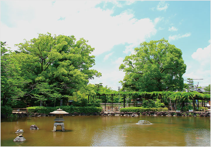 豊臣秀吉の誕生を記念して、明治18年に建てられた豊國神社を中心に整備された純日本風廻遊式林泉庭園をもつ公園です。フジの名所でもあります。