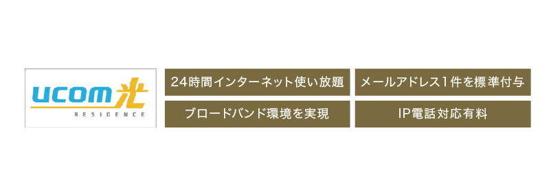 (つなぐネットコミュニケーションズ)「UCOM光 レジデンス」の光ファイバーによる24時間常時接続の高速インターネットサービスがご利用いただけます。マンションまで直接1Gbpsの光ファイバーを引き込むので棟内はLAN配線により最大速度1Gbpsの高品質で安定した高速通信が可能です(Wi-Fi対応)。オプションでIP電話もご利用いただけます。