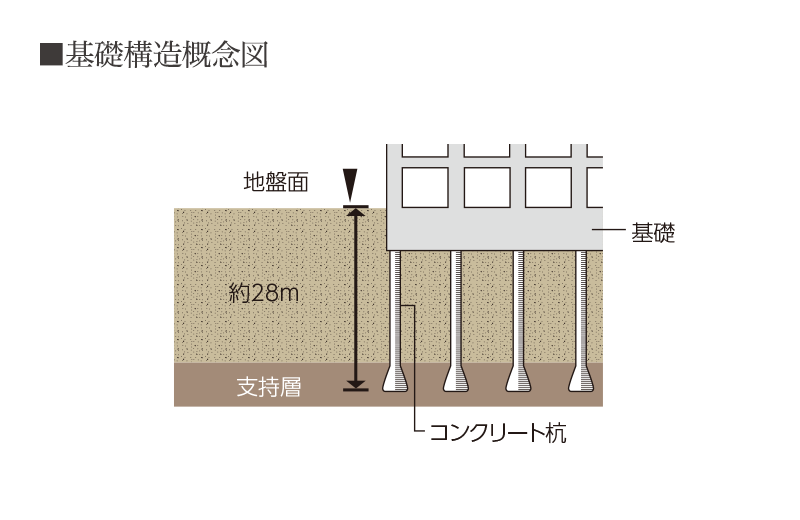 当マンションでは綿密な地盤調査を実施し、万が一の地震に備え、基礎構造は合計9本の場所打ちコンクリート杭を地中約28m以深の強固な地盤支持層まで打ち、建物を支えています。