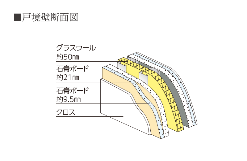 厚さ約136㎜の乾式壁としました。充分な厚さを確保することで遮音性を高め、プライバシー性を守ります。