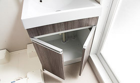 洗面台下は洗面用具をストックできる収納スペースになっています。