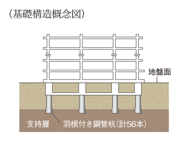 綿密な地盤調査を実施し、羽根付き鋼管杭56本を約7.9m以深の支持層まで打ち込み、強固な基礎を形成しています。