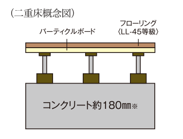 コンクリートスラブ厚約180㎜※の二重床は、下層への振動や騒音等を減少させ、適度な弾力のある心地よい歩行感が得られます。